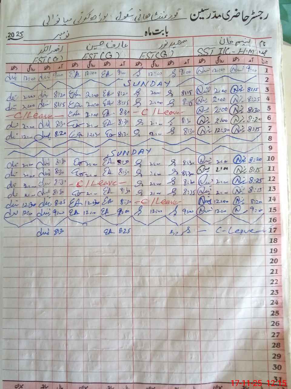 | CNIC | Full Name | Designation | R/C | Absence During Last Calender Month |