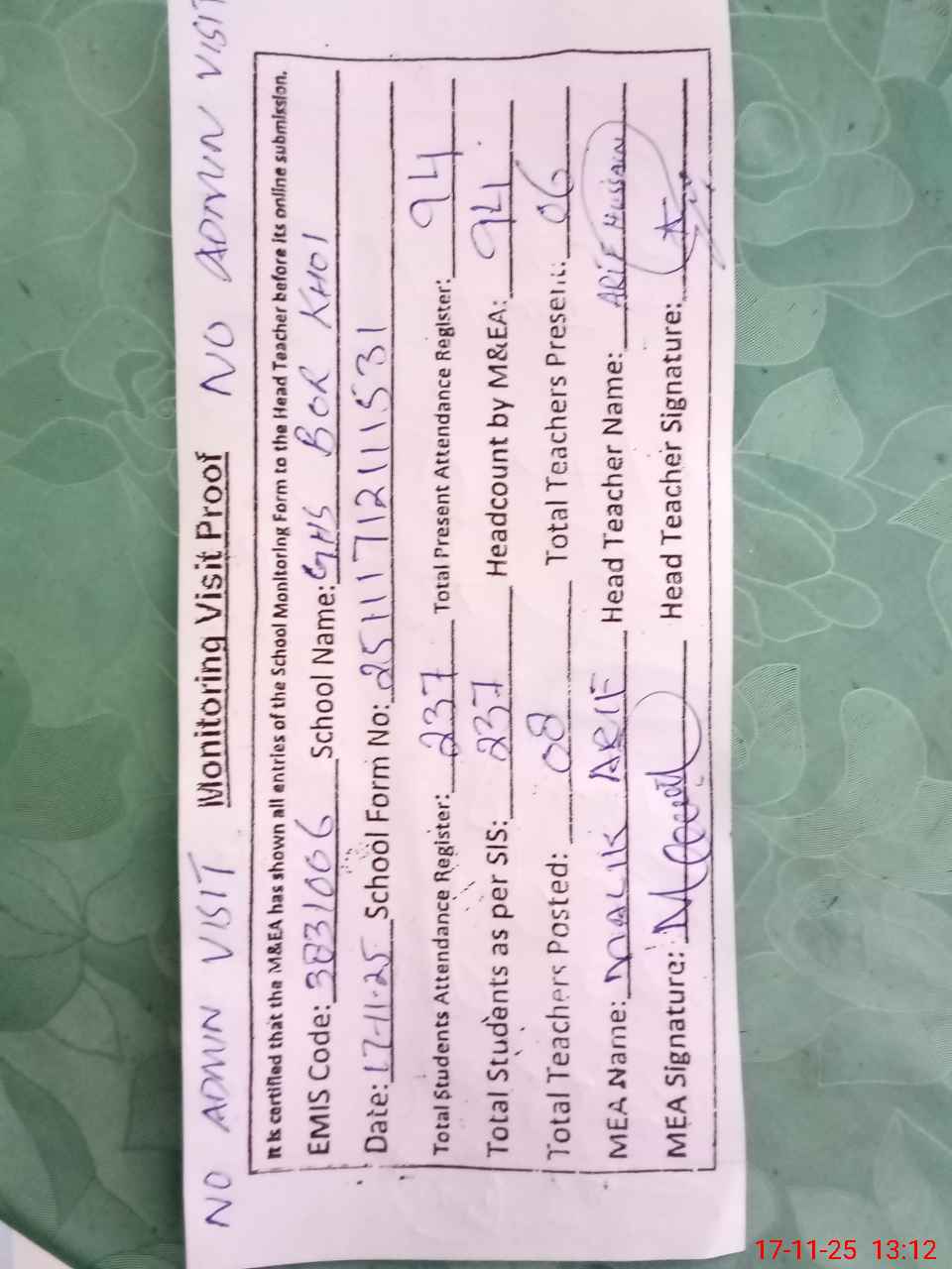 | Attendance Register | Head Teacher | MEA with School | Visit Proof |