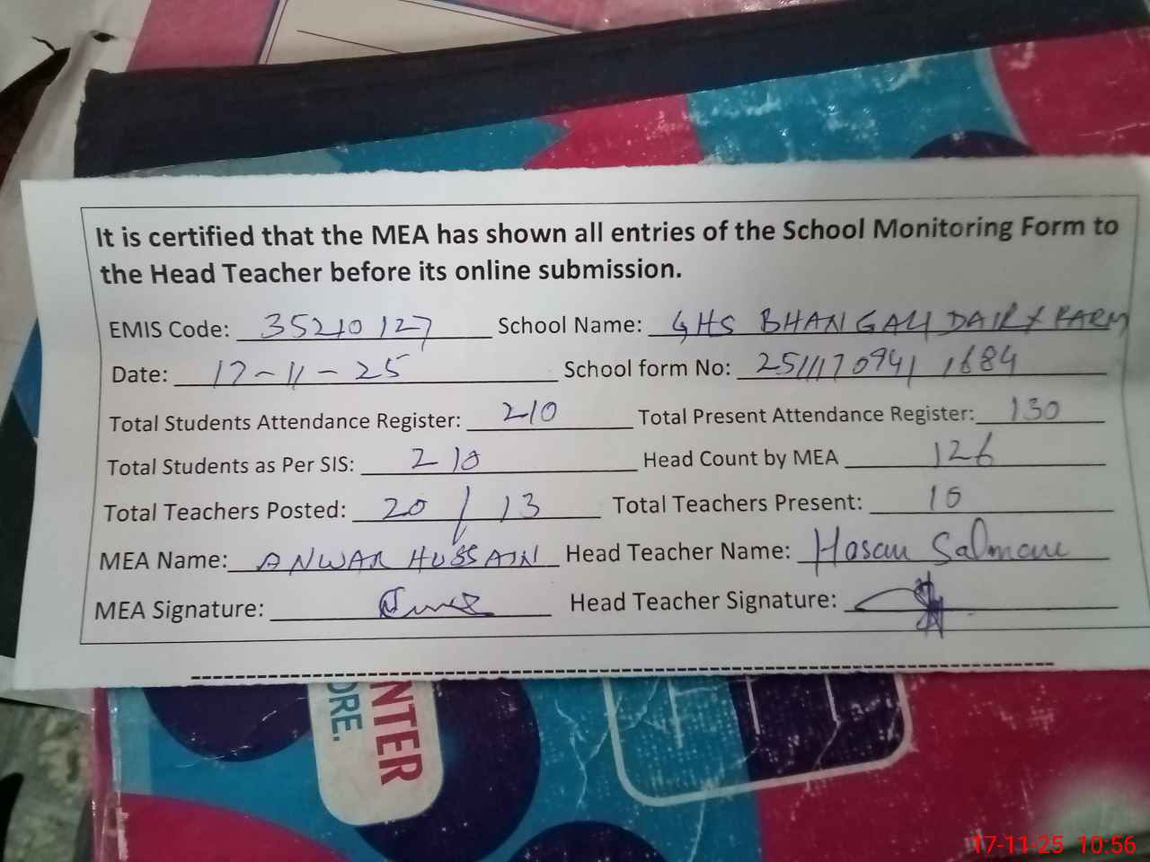 | Attendance Register | Head Teacher | MEA with School | Visit Proof |