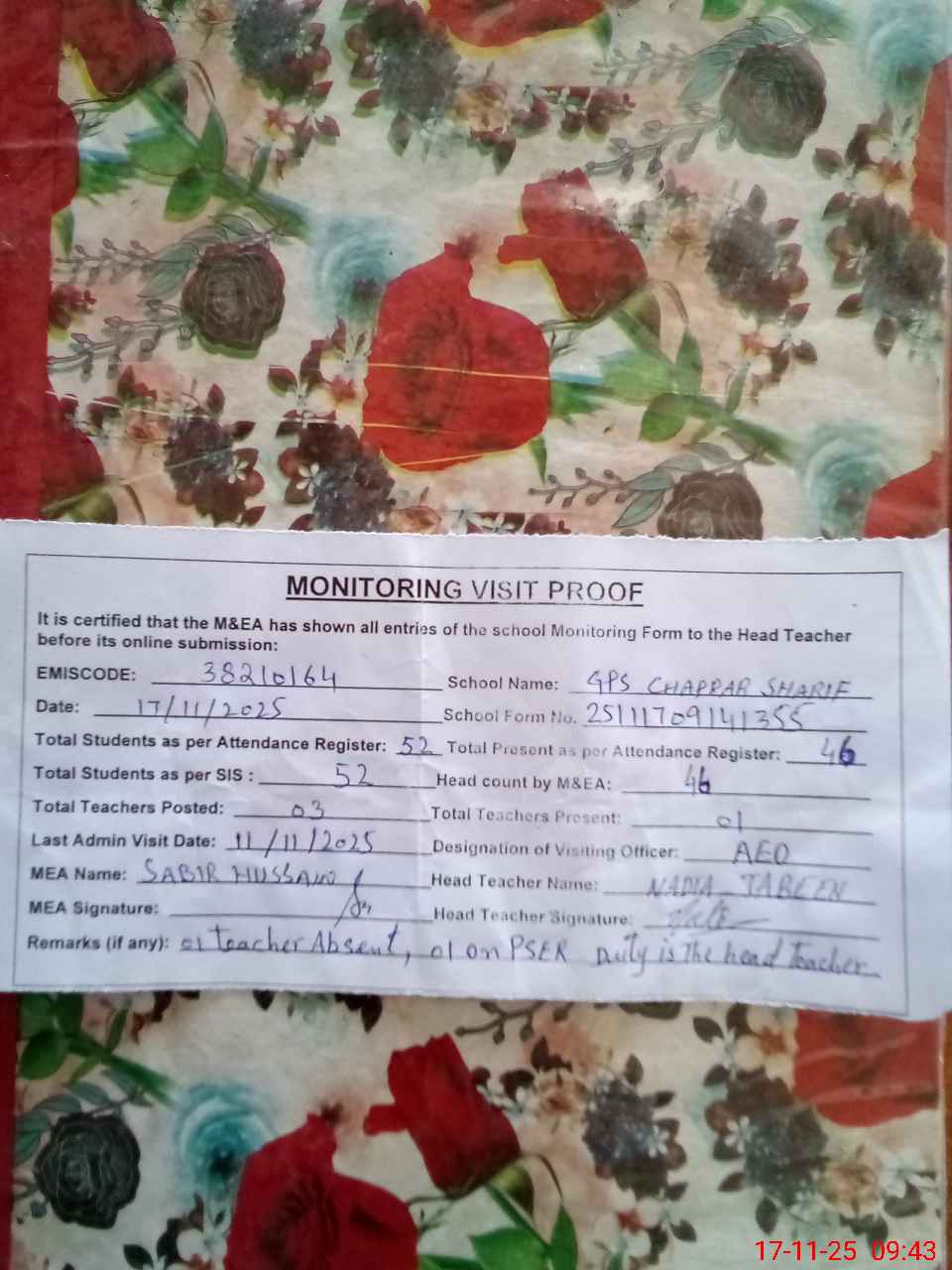 | Remarks (Use Separate Page if Required): 01 teacher absent 01 teacher on PSER duty Last admin visit by AEO on 11 Nov 2025 | |||||