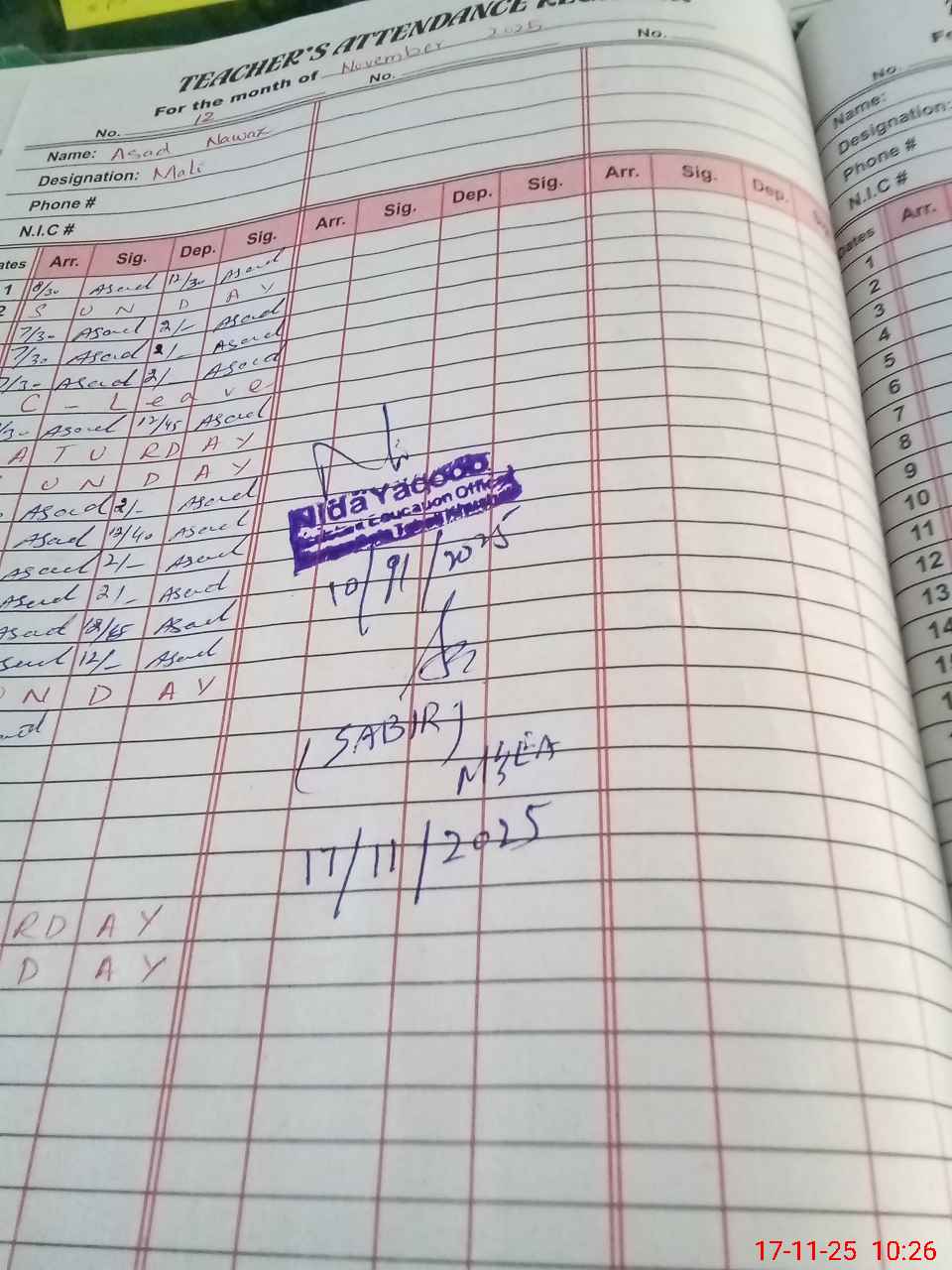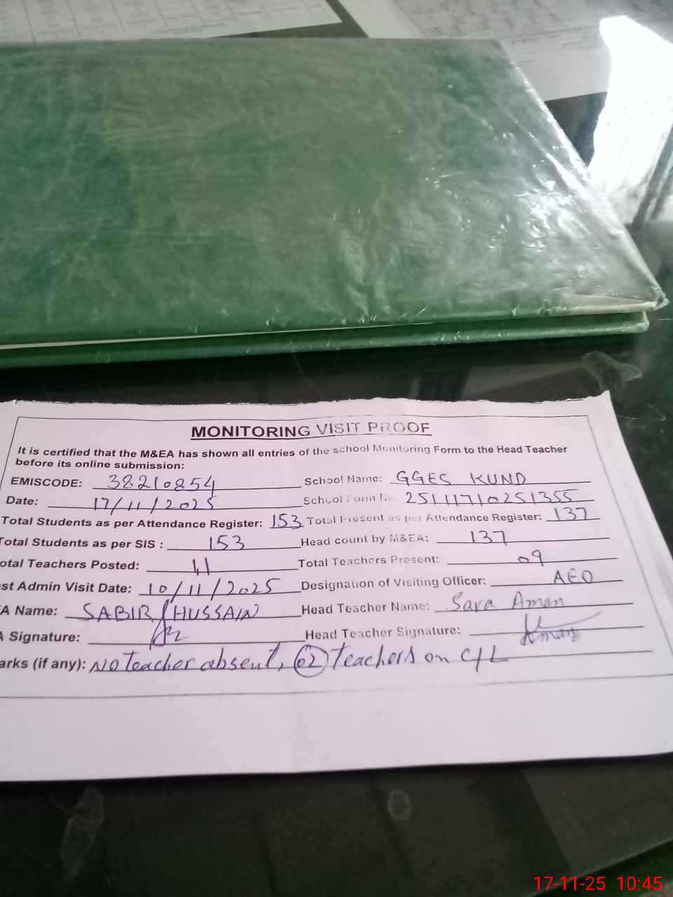 | Remarks (Use Separate Page if Required): No teacher absent 02 teachers are on casual leave Last admin visit by AEO on 10 Nov 2025 | |||||