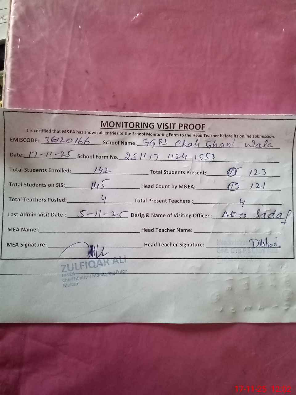 | Attendance Register | Head Teacher | MEA with School | Visit Proof |