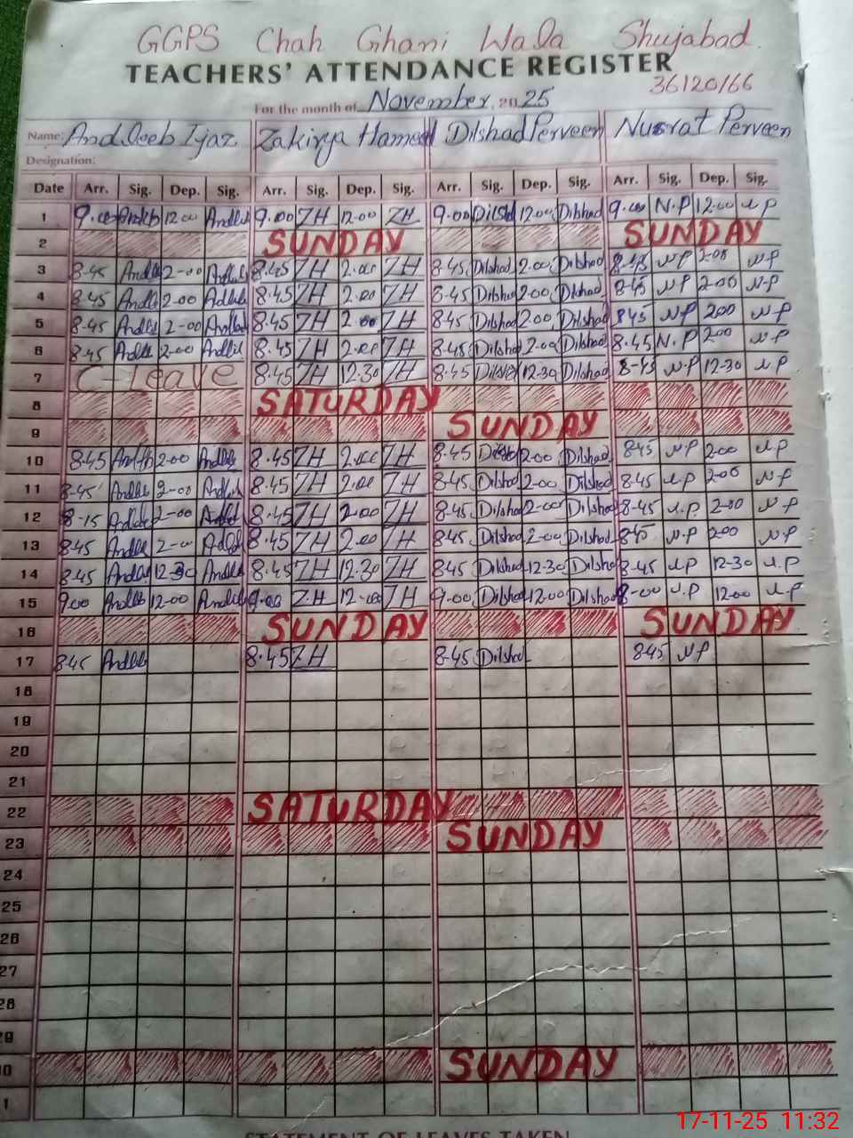 | CNIC | Full Name | Designation | R/C | Absence During Last Calender Month |