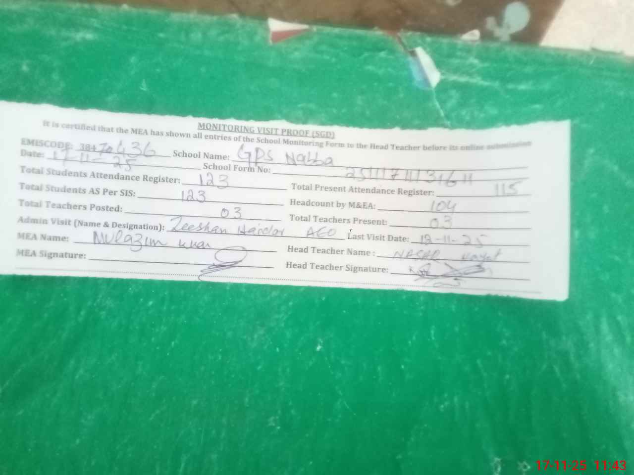 | Attendance Register | Head Teacher | MEA with School | Visit Proof |