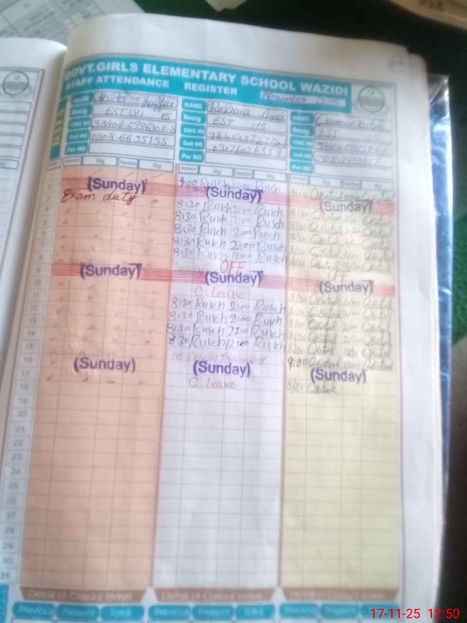 | CNIC | Full Name | Designation | R/C | Absence During Last Calender Month |
