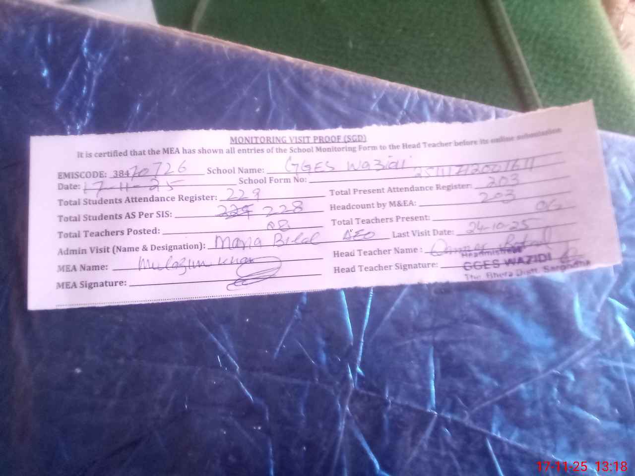 | Attendance Register | Head Teacher | MEA with School | Visit Proof |