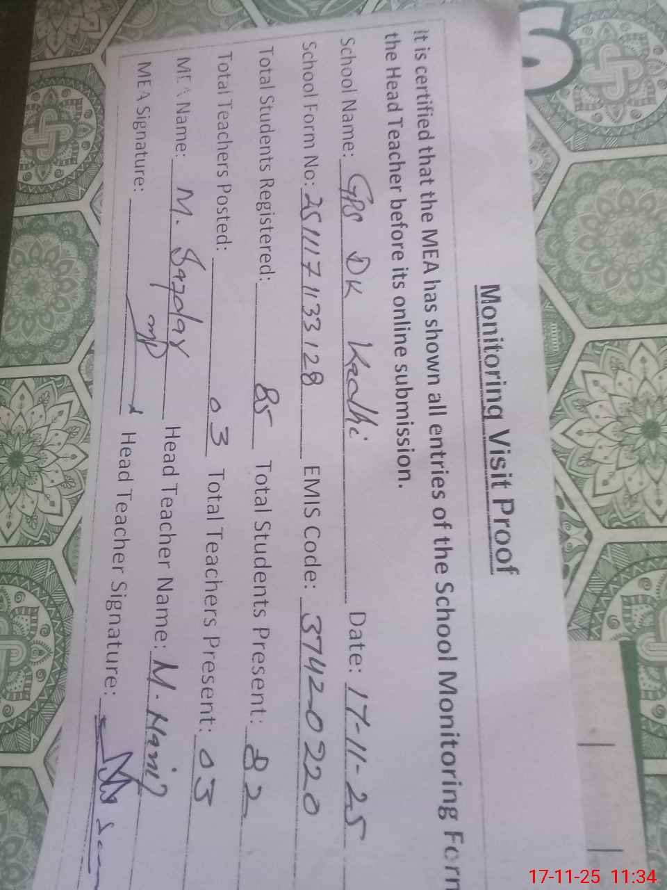 | Attendance Register | Head Teacher | MEA with School | Visit Proof |