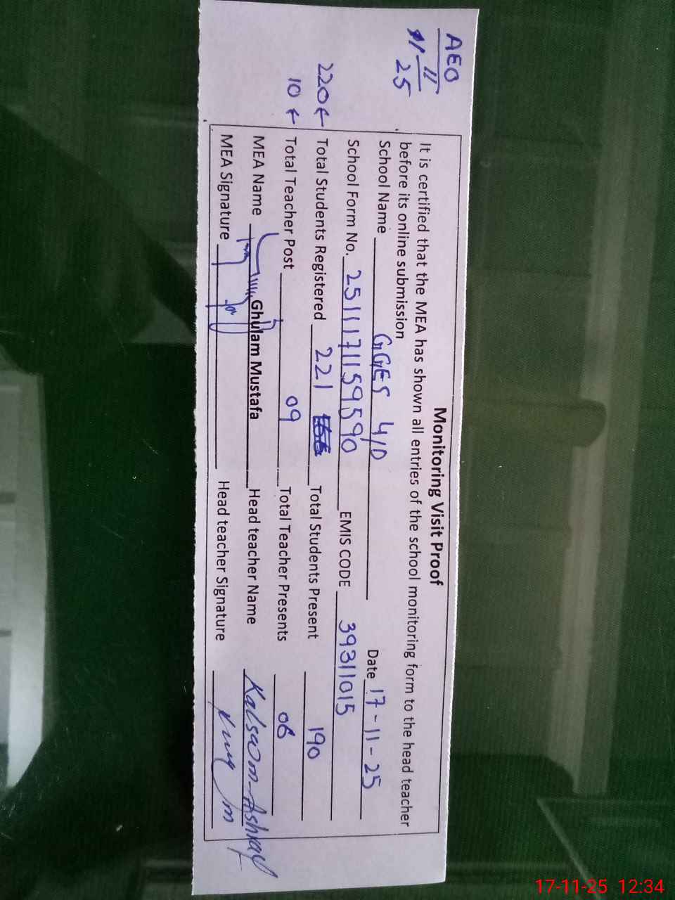 | Attendance Register | Head Teacher | MEA with School | Visit Proof |