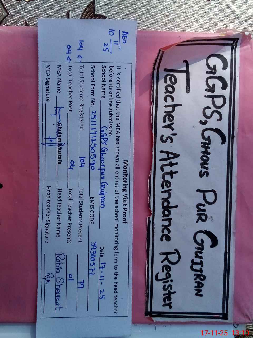 | Attendance Register | Head Teacher | MEA with School | Visit Proof |