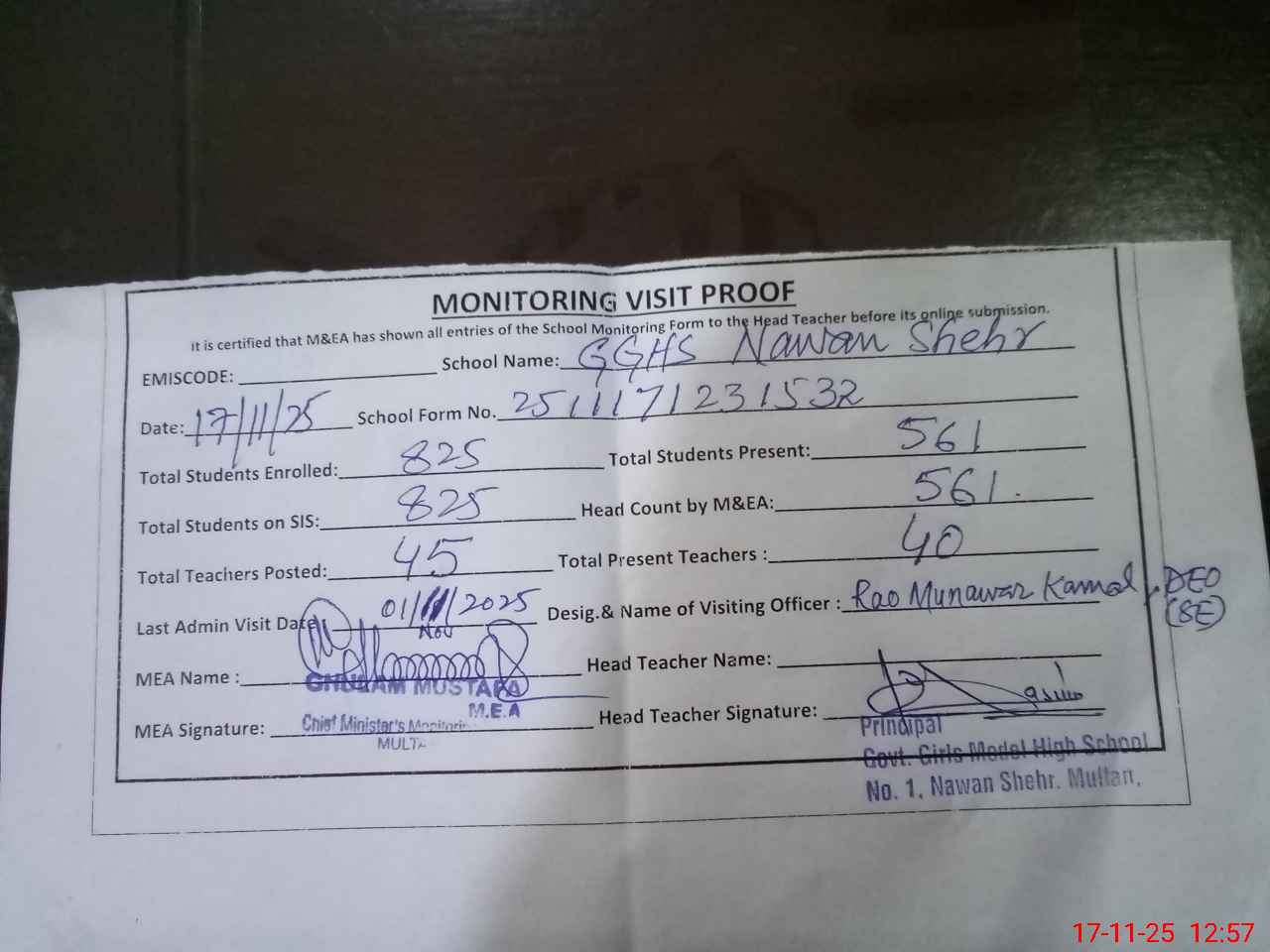 | EMIS Code: 36110029 | Name of School: GGHS MODEL NO.1 NAWAN SHER MULTAN | |||