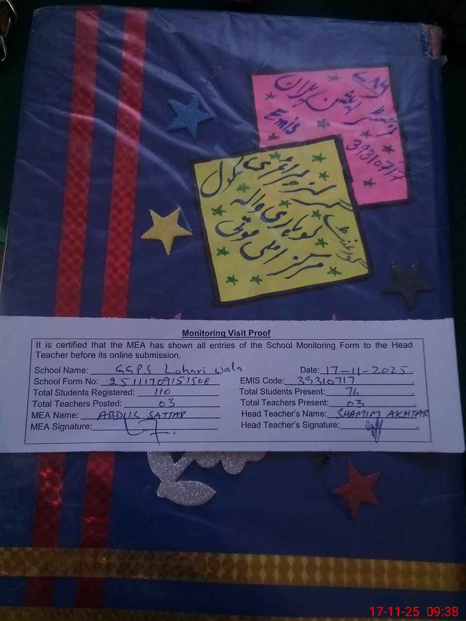 | Attendance Register | Head Teacher | MEA with School | Visit Proof |