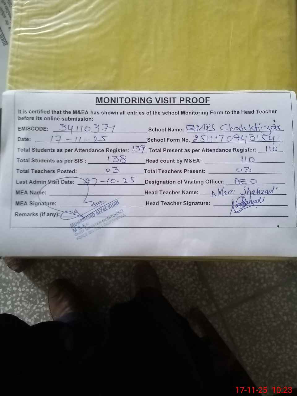 | Attendance Register | Head Teacher | MEA with School | Visit Proof |