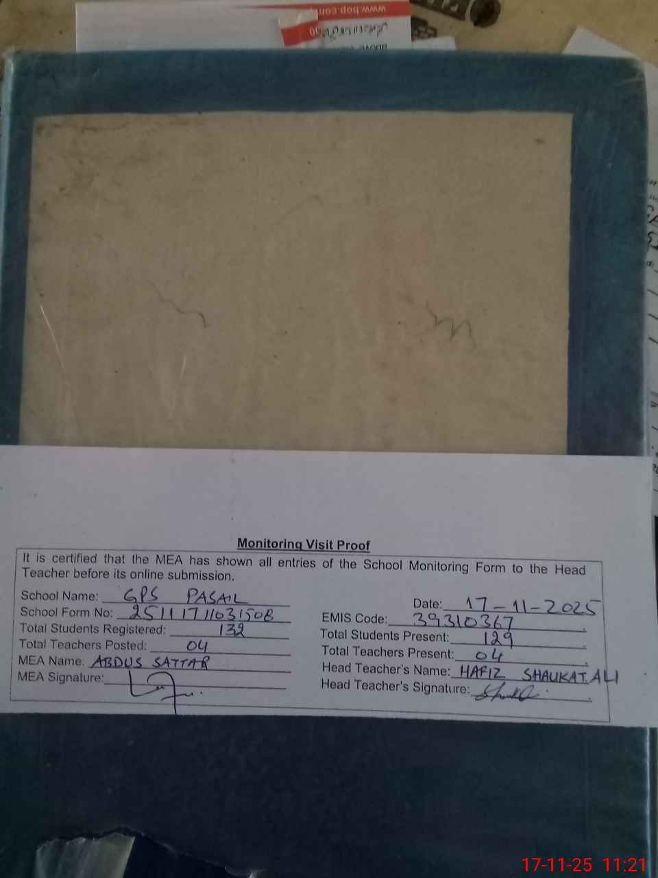 | Attendance Register | Head Teacher | MEA with School | Visit Proof |