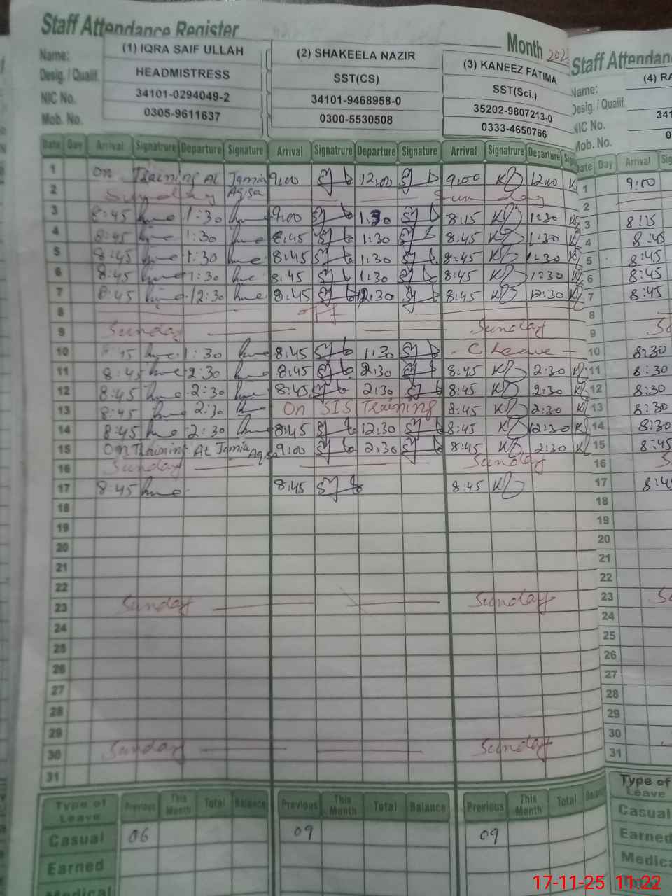 | CNIC | Full Name | Designation | R/C | Absence During Last Calender Month |