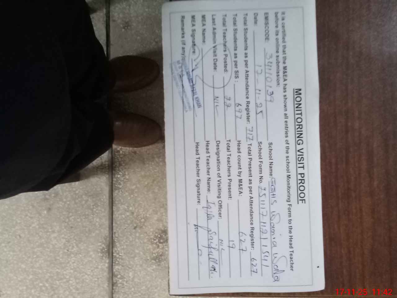 | Attendance Register | Head Teacher | MEA with School | Visit Proof |