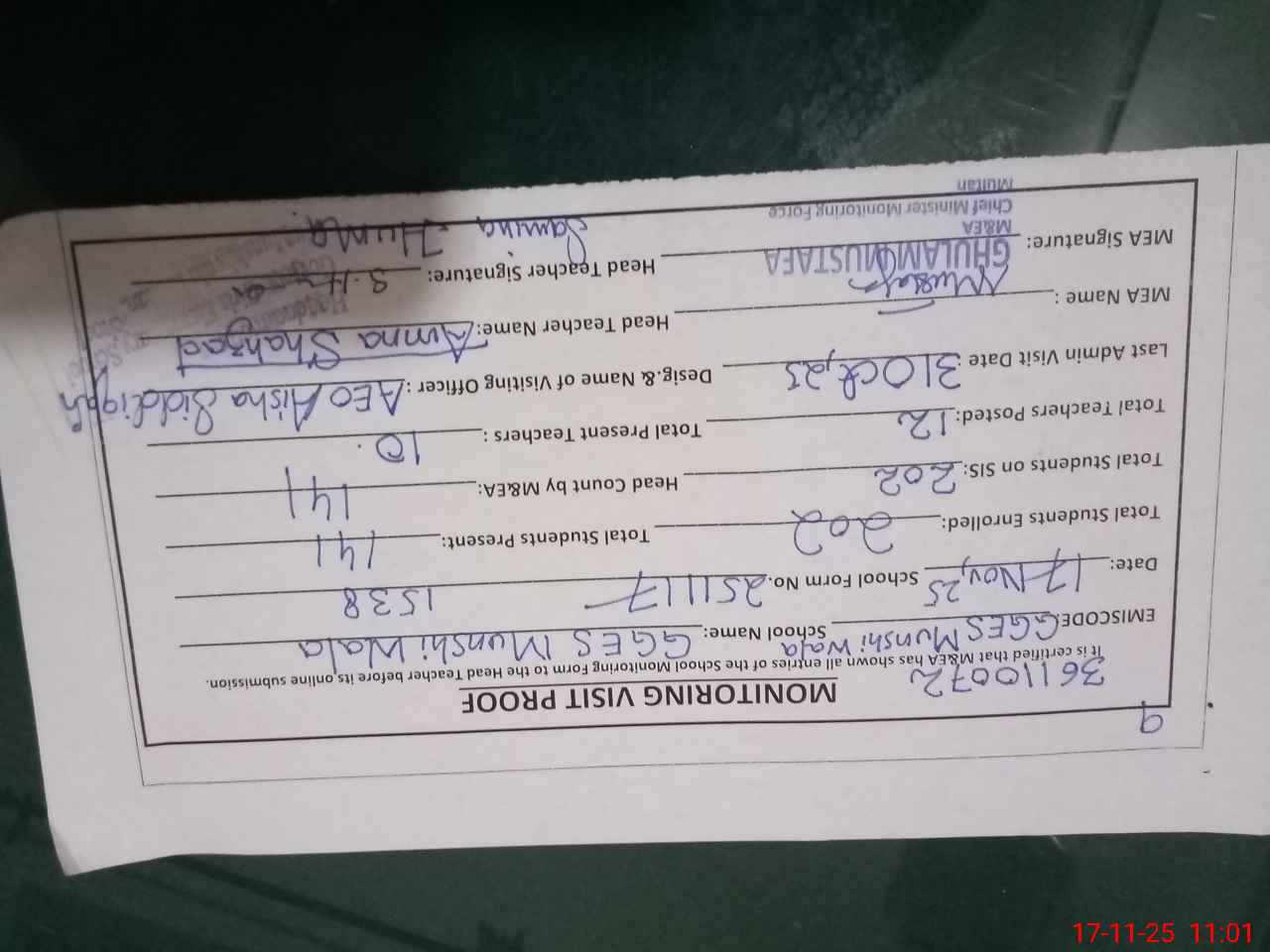 | Attendance Register | Head Teacher | MEA with School | Visit Proof |