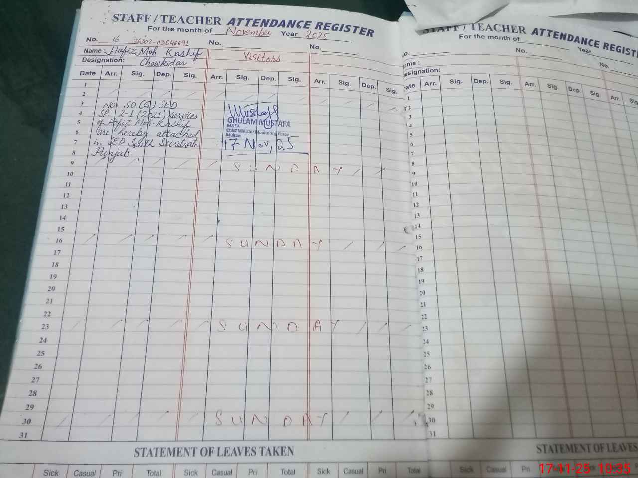 | 36**** | Ha**** Mu**** Ka**** | CHOWKIDAR | Regular | 0 | 0 | 0 | 0 | 0 | 0 | 0 | 0 | 0 | Absent (Un-Authorized) |