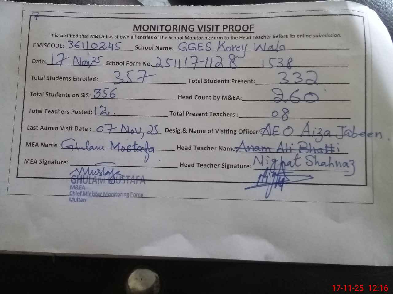 | Attendance Register | Head Teacher | MEA with School | Visit Proof |