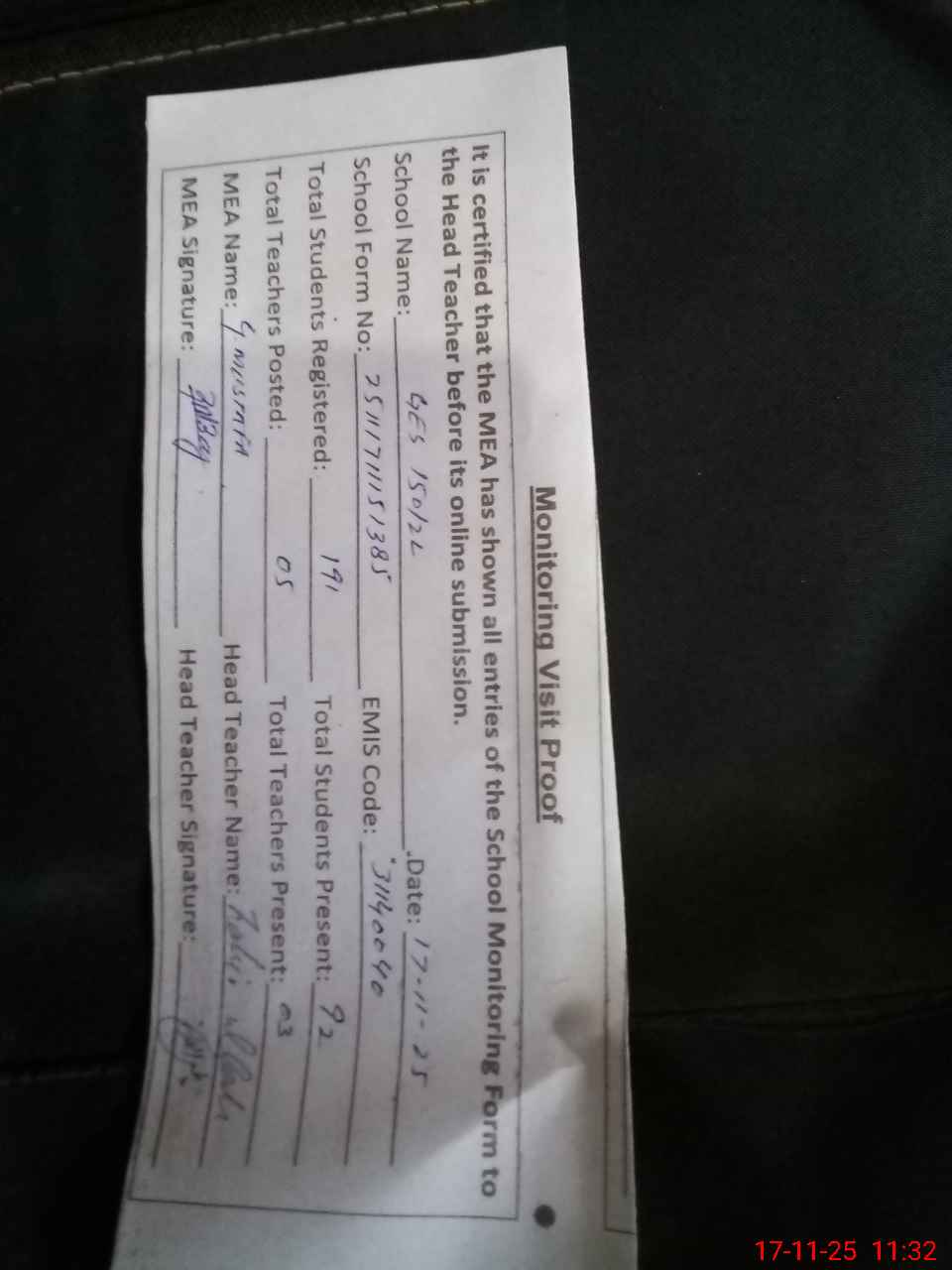 | Attendance Register | Head Teacher | MEA with School | Visit Proof |