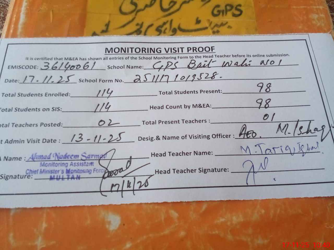 | EMIS Code: 36140061 | Name of School: GPS BAIT WAHI NO.1 | |||