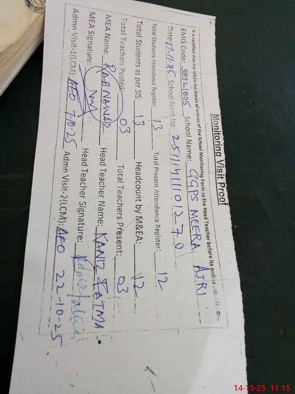 | Attendance Register | Head Teacher | MEA with School | Visit Proof |