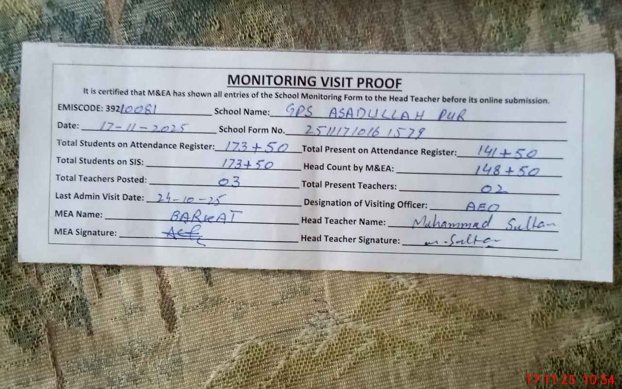 | EMIS Code: 39210081 | Name of School: GPS ASADULLAH PUR | |||