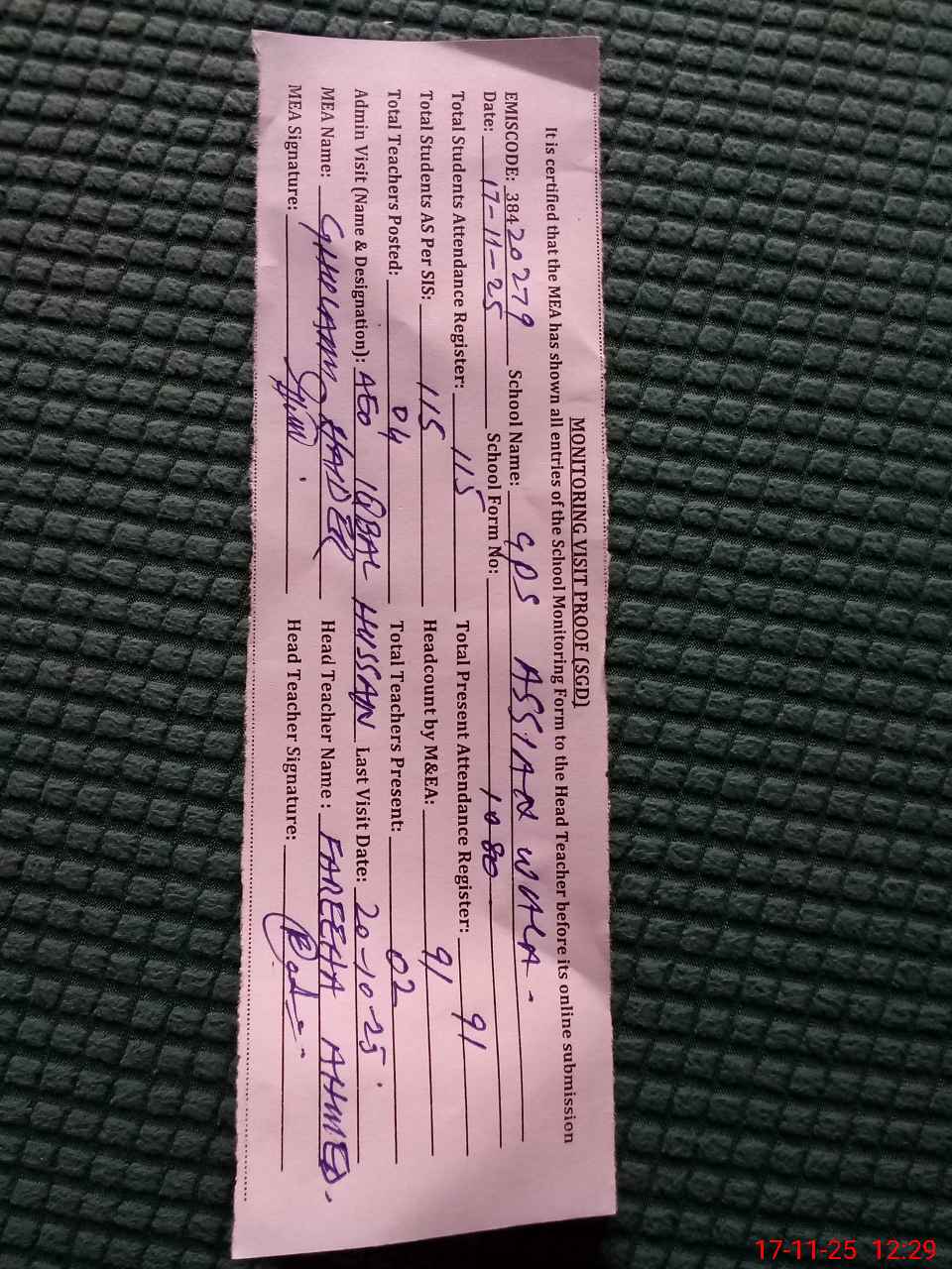| EMIS Code: 38420279 | Name of School: GPS NO.2 ASIAN WALA | |||