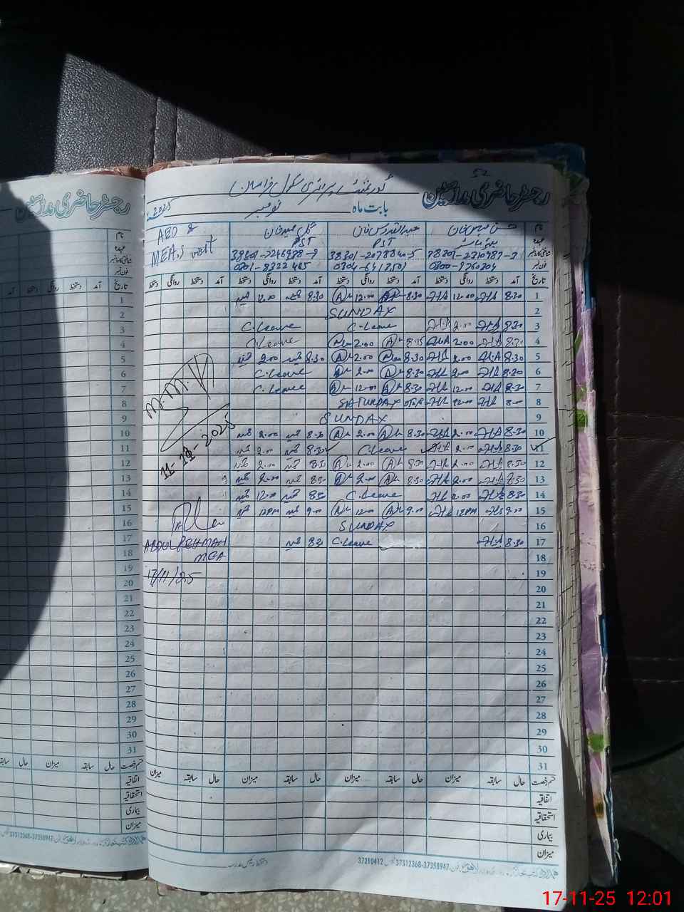 | CNIC | Full Name | Designation | R/C | Absence During Last Calender Month |