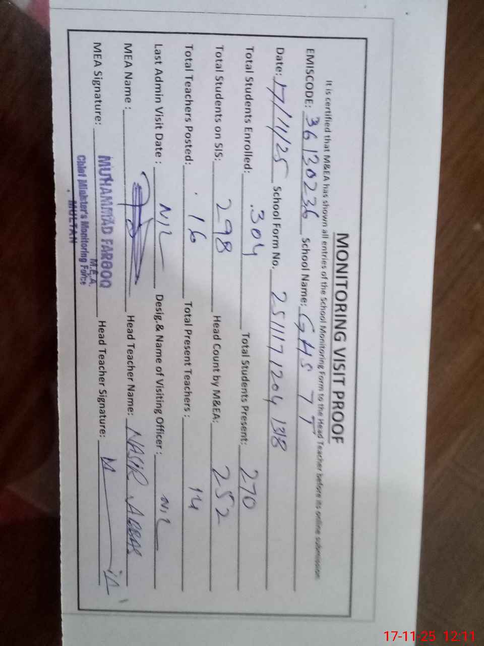 | EMIS Code: 36130031 | Name of School: GHS CHAK 7 T MULTAN | |||
