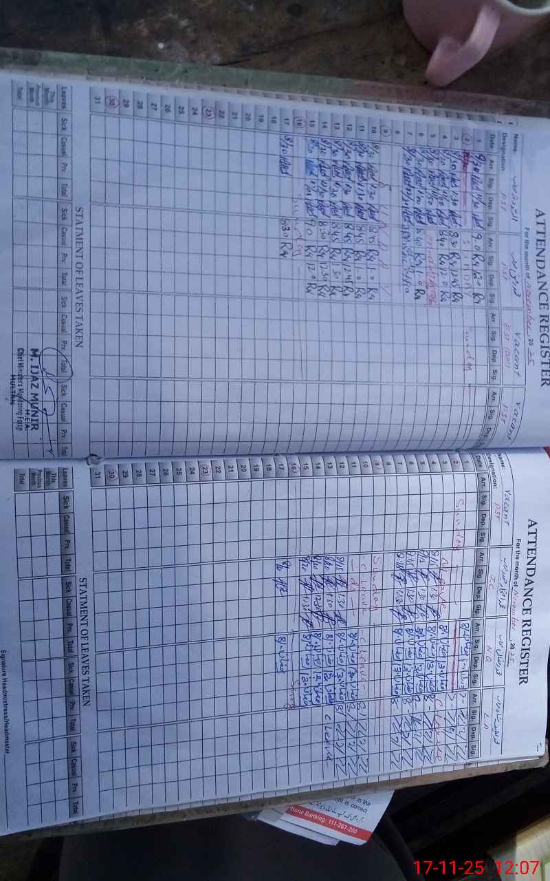 | CNIC | Full Name | Designation | R/C | Absence During Last Calender Month |