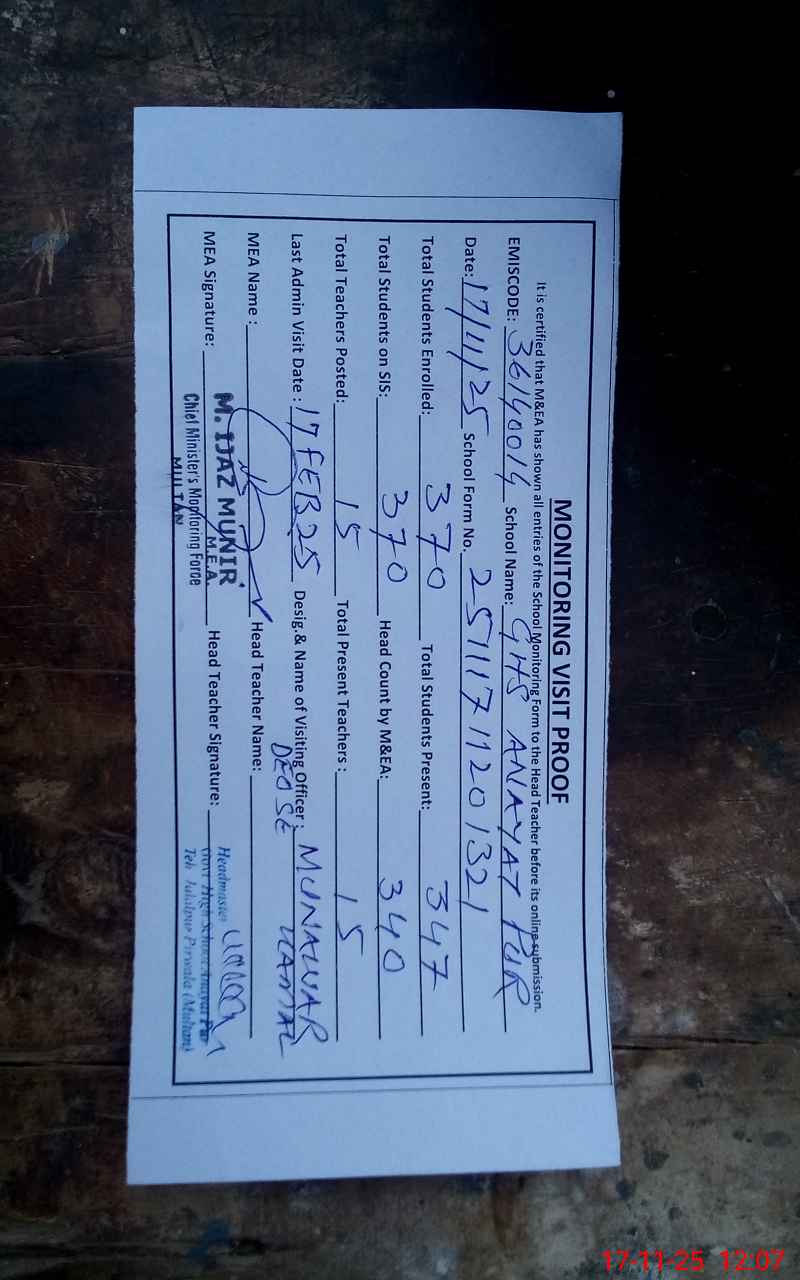 | EMIS Code: 36140014 | Name of School: GHS ANAYAT PUR | |||