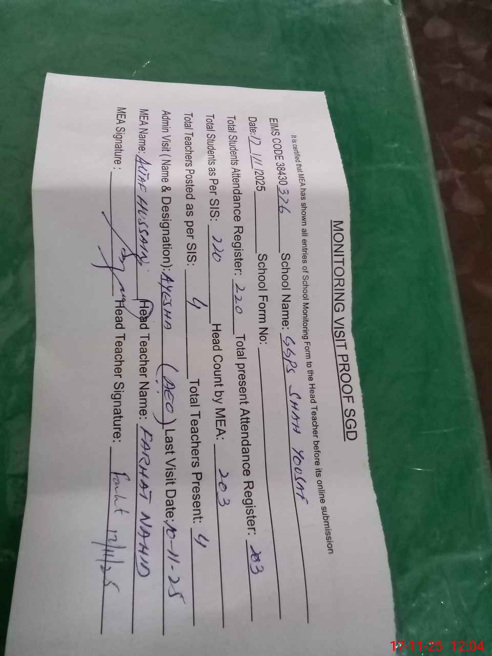 | Attendance Register | Head Teacher | MEA with School | Visit Proof |