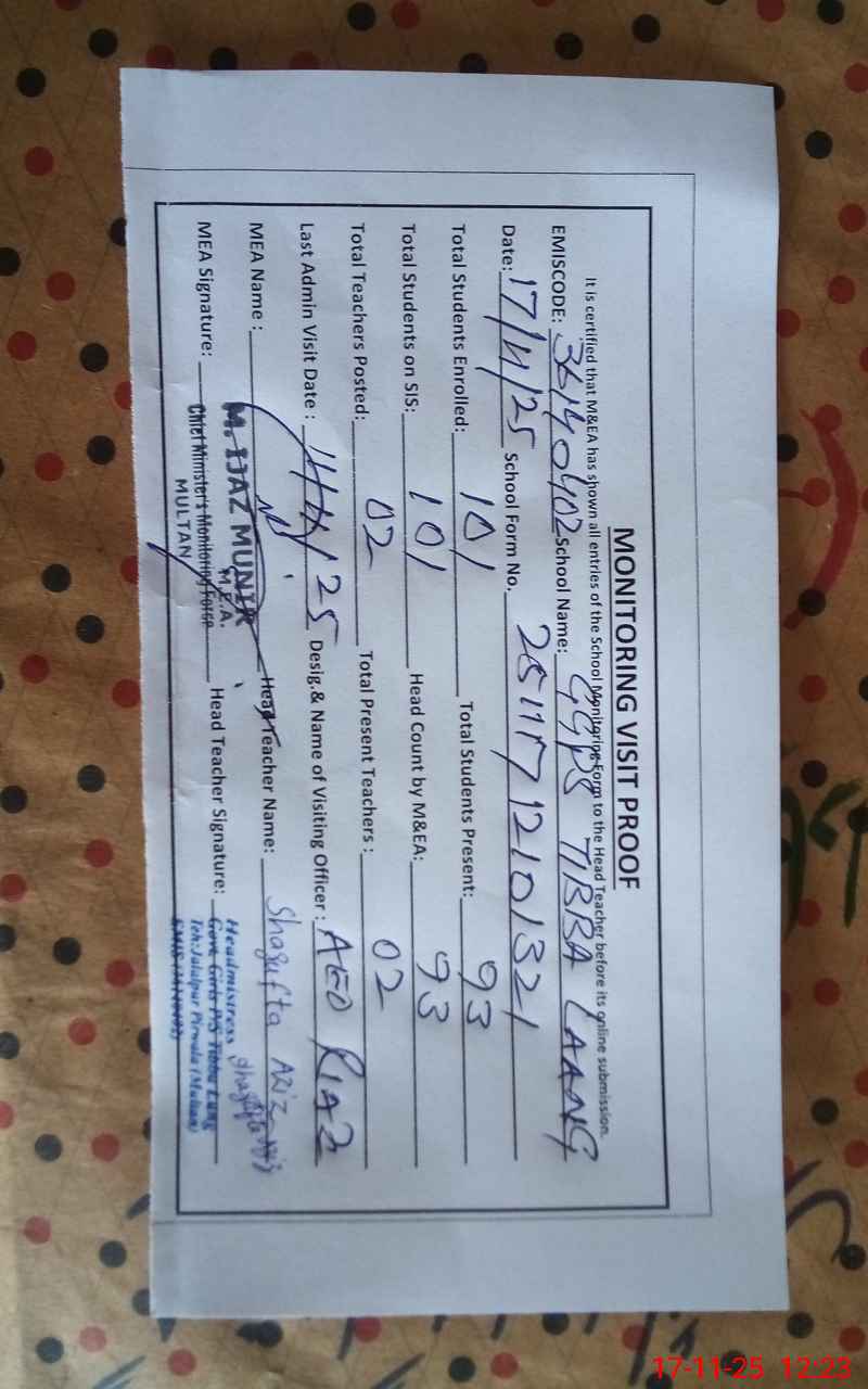| District: MULTAN | Tehsil: JALALPUR PIRWALA | Markaz: ALI PUR SADAT - FEMALE | Level: Primary | |