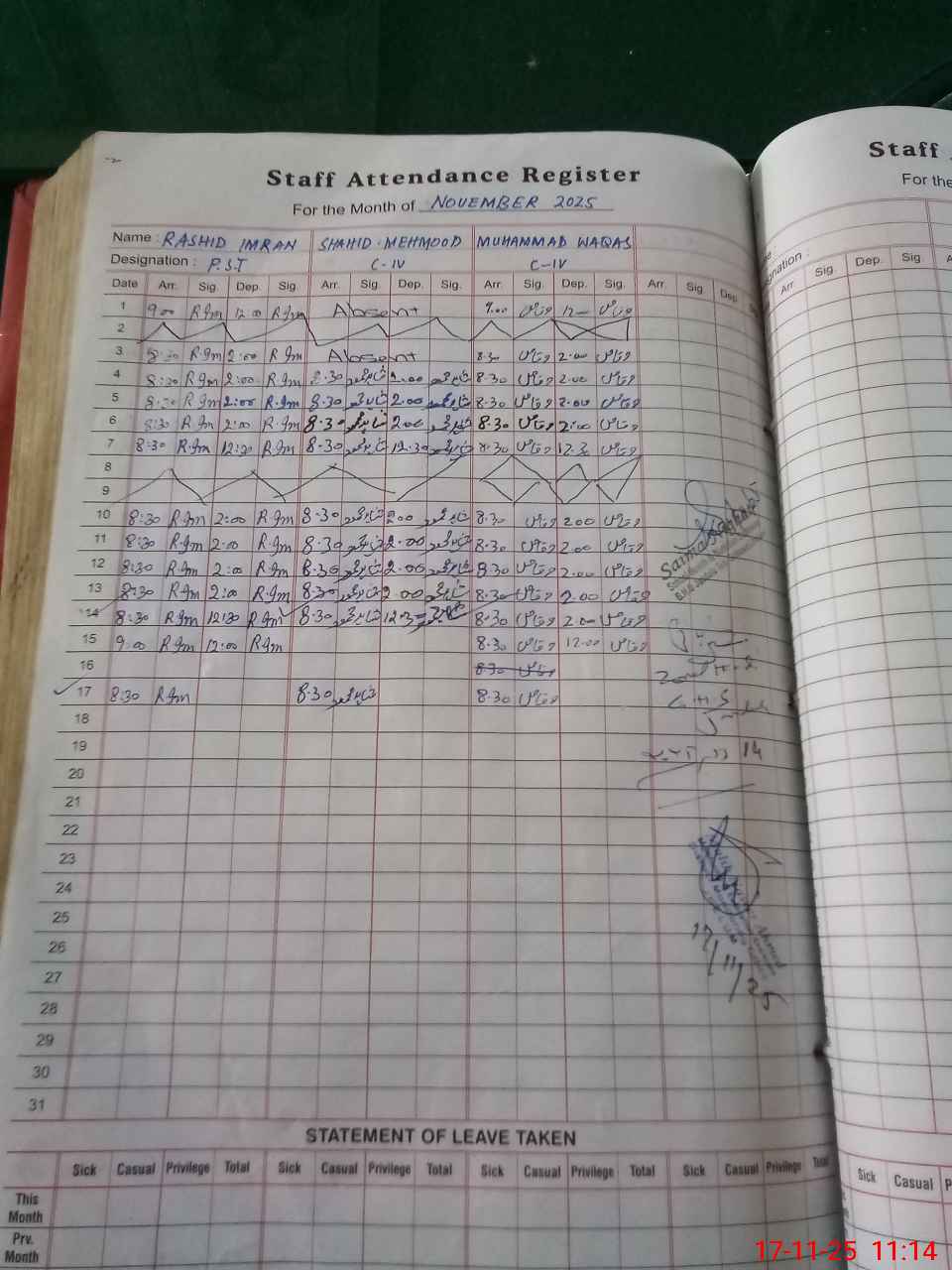 | CNIC | Full Name | Designation | R/C | Absence During Last Calender Month |