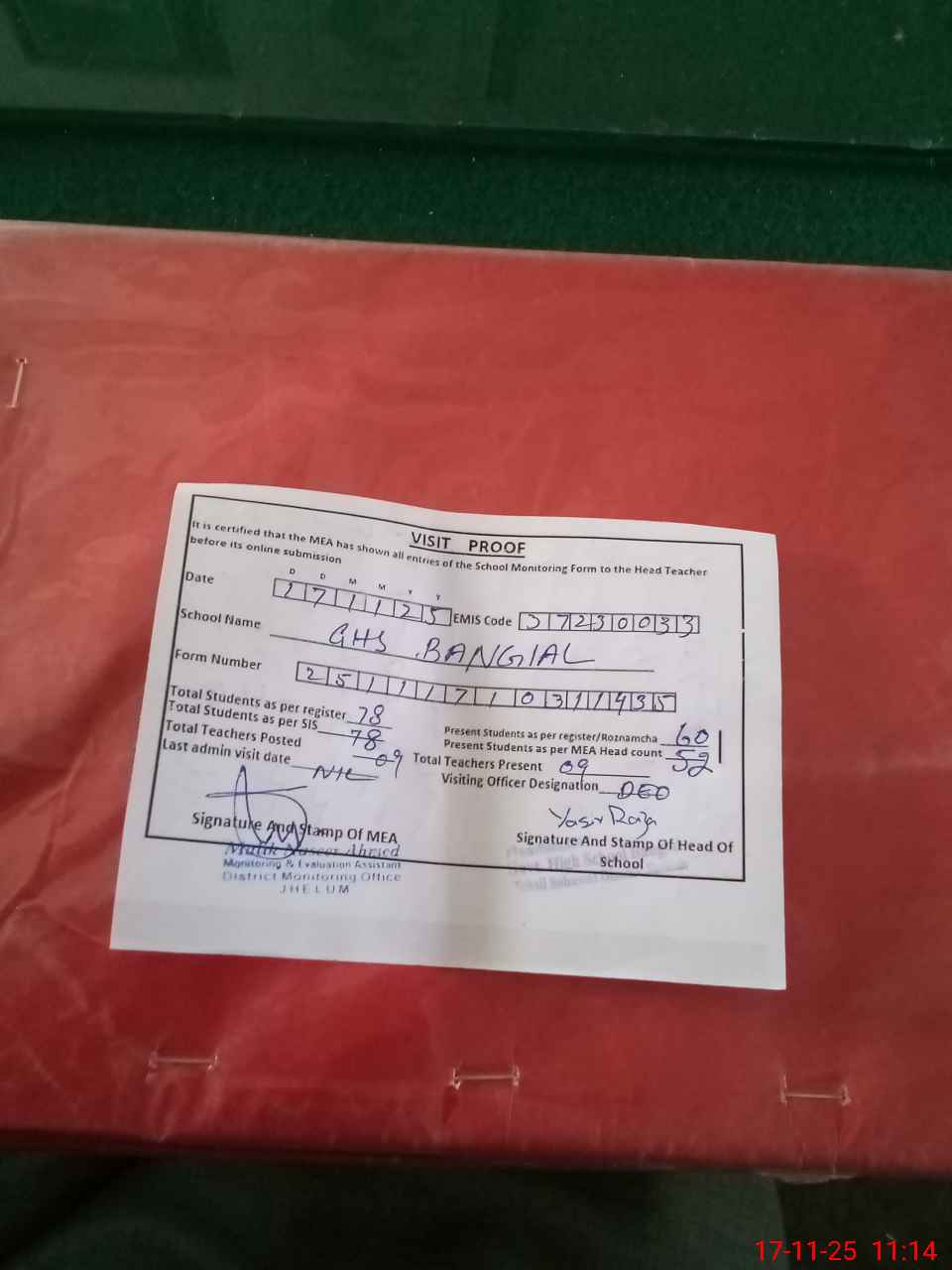 | Attendance Register | Head Teacher | MEA with School | Visit Proof |