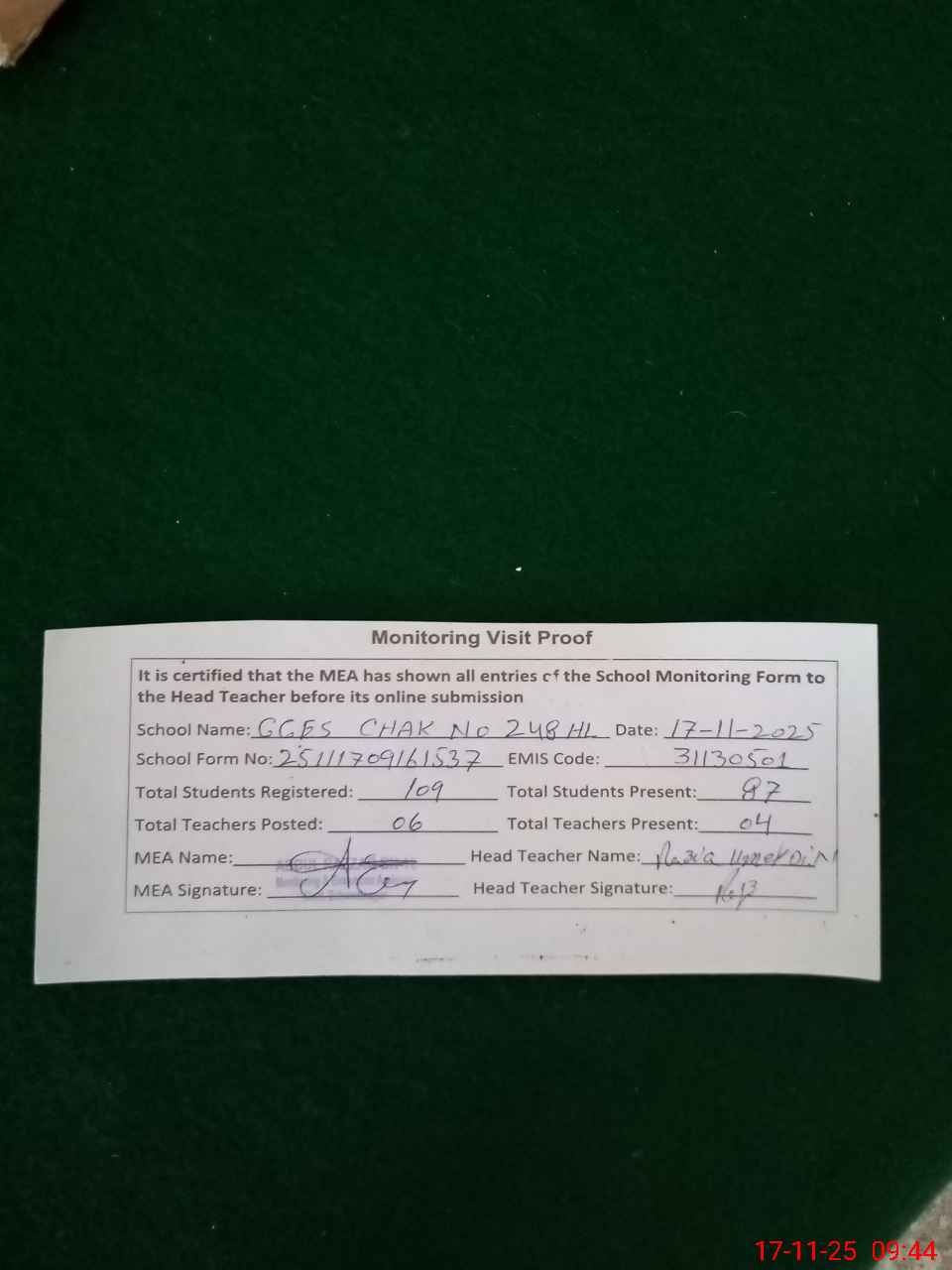 | Attendance Register | Head Teacher | MEA with School | Visit Proof |
