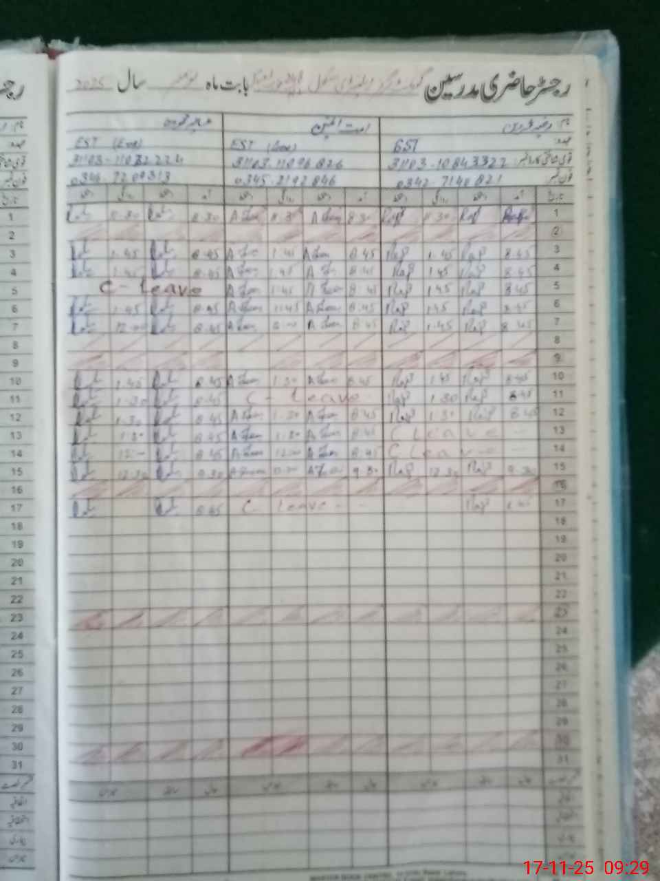 | CNIC | Full Name | Designation | R/C | Absence During Last Calender Month |