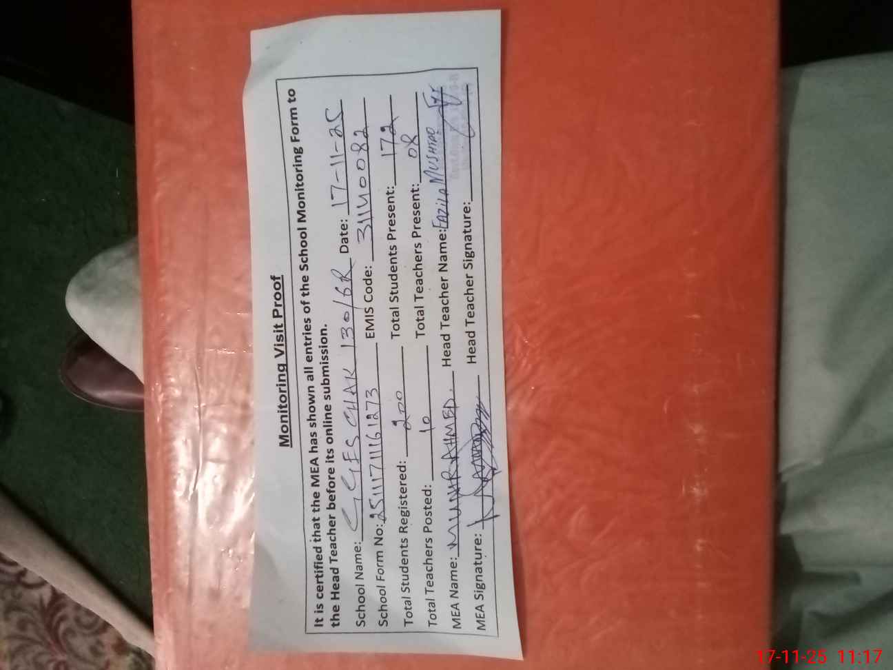 | Attendance Register | Head Teacher | MEA with School | Visit Proof |
