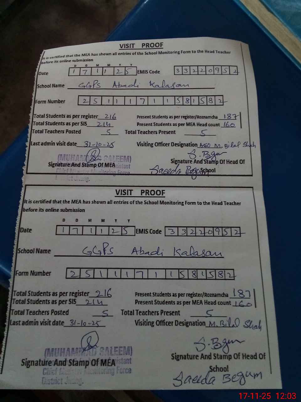 | Attendance Register | Head Teacher | MEA with School | Visit Proof |