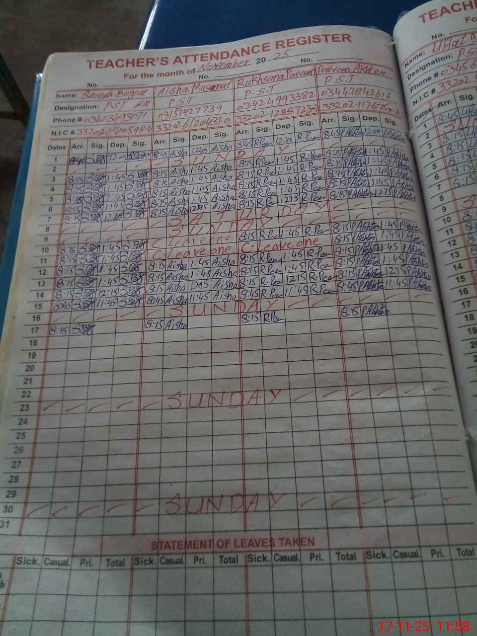 | CNIC | Full Name | Designation | R/C | Absence During Last Calender Month |