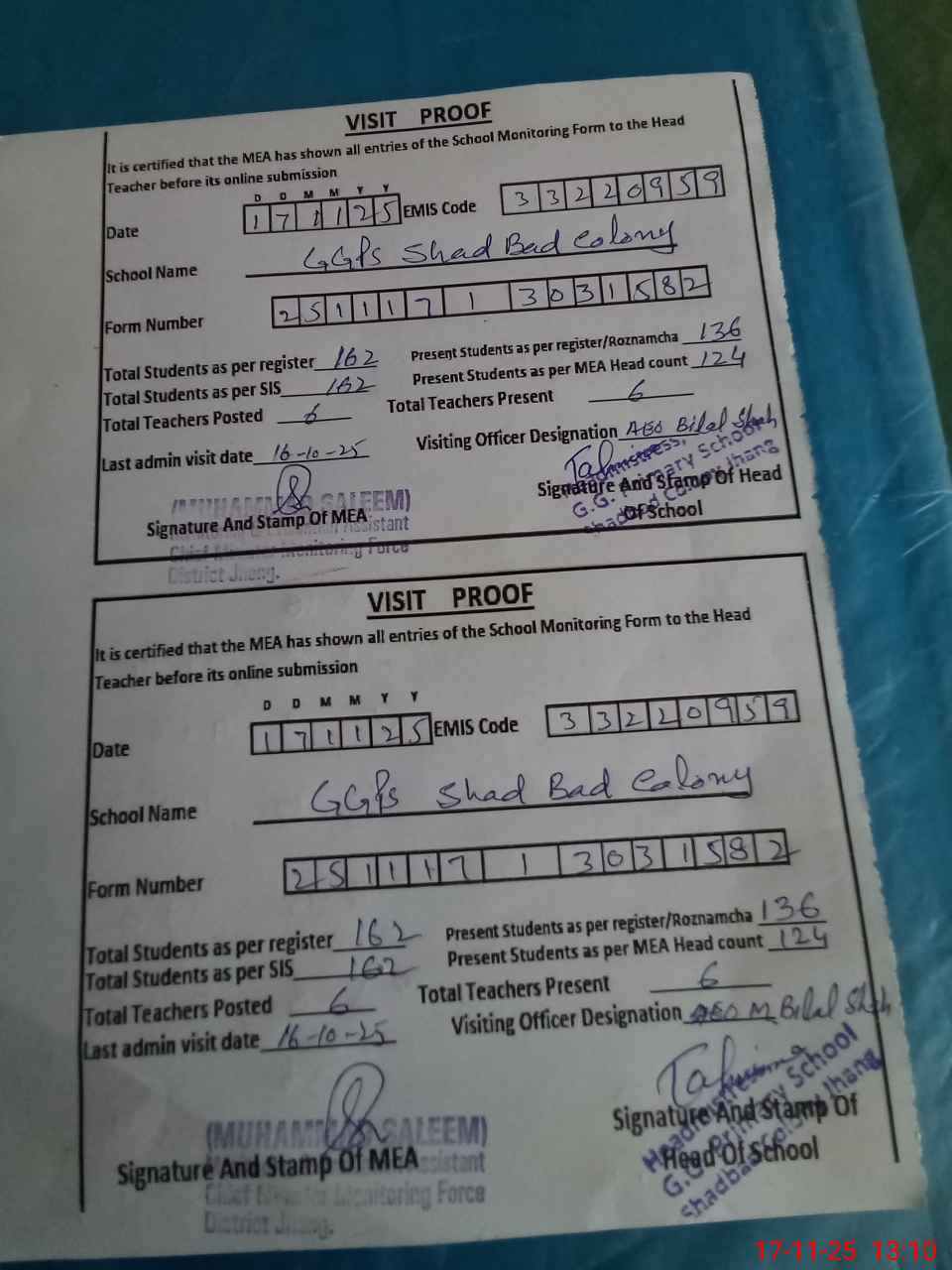 | EMIS Code: 33220959 | Name of School: GMPS SHAD BAD COLONY | |||