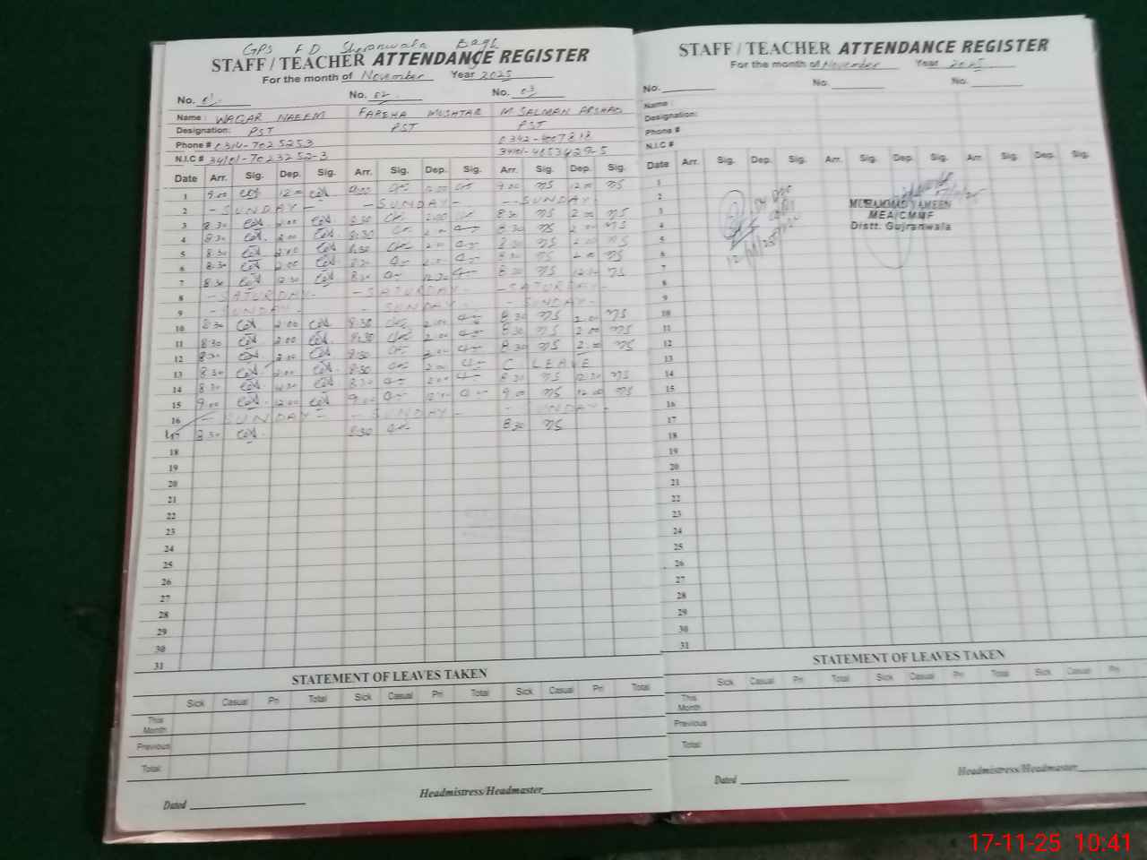 | CNIC | Full Name | Designation | R/C | Absence During Last Calender Month |