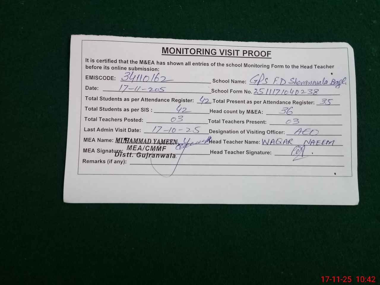 | Attendance Register | Head Teacher | MEA with School | Visit Proof |