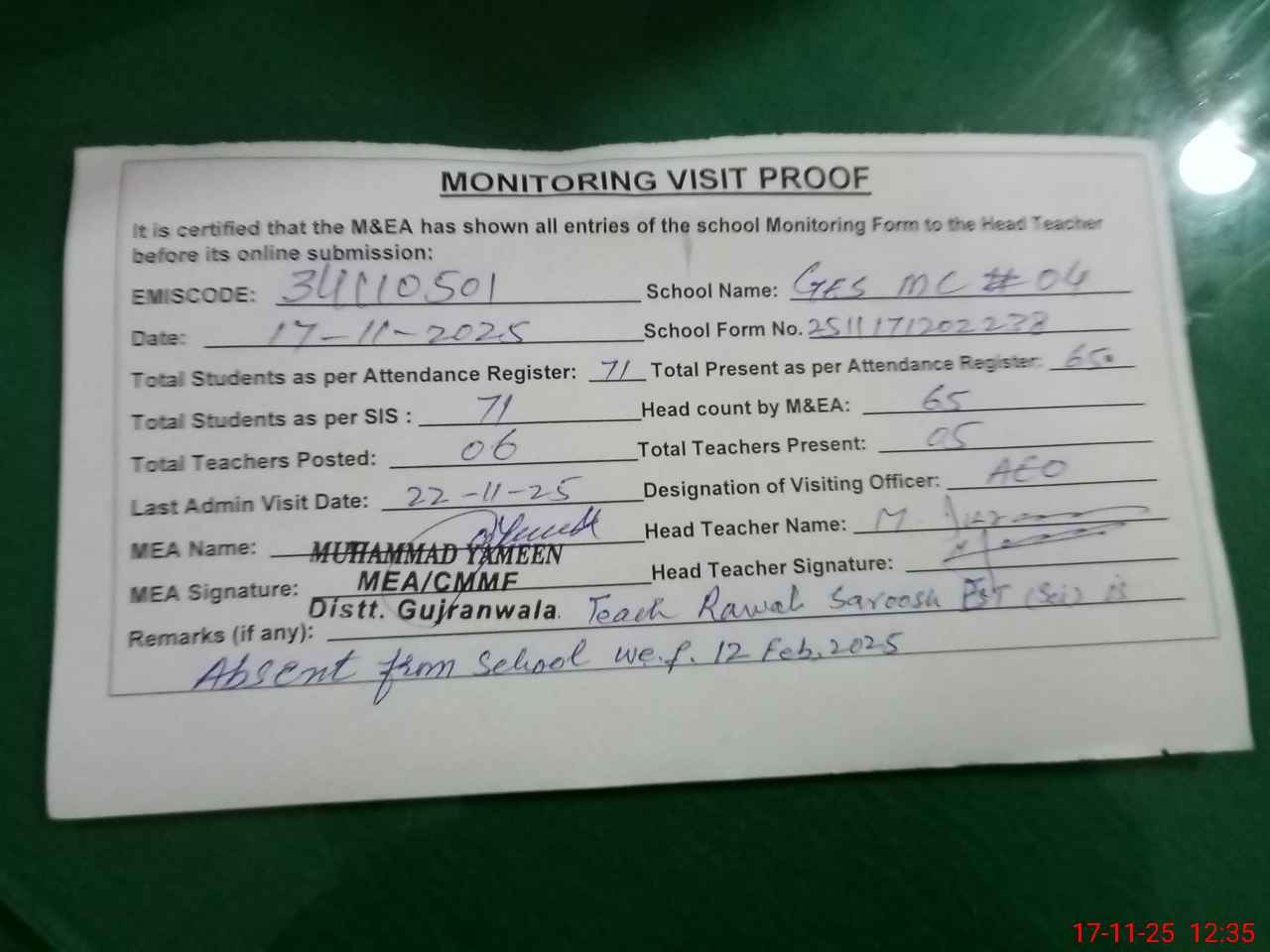 | Attendance Register | Head Teacher | MEA with School | Visit Proof |