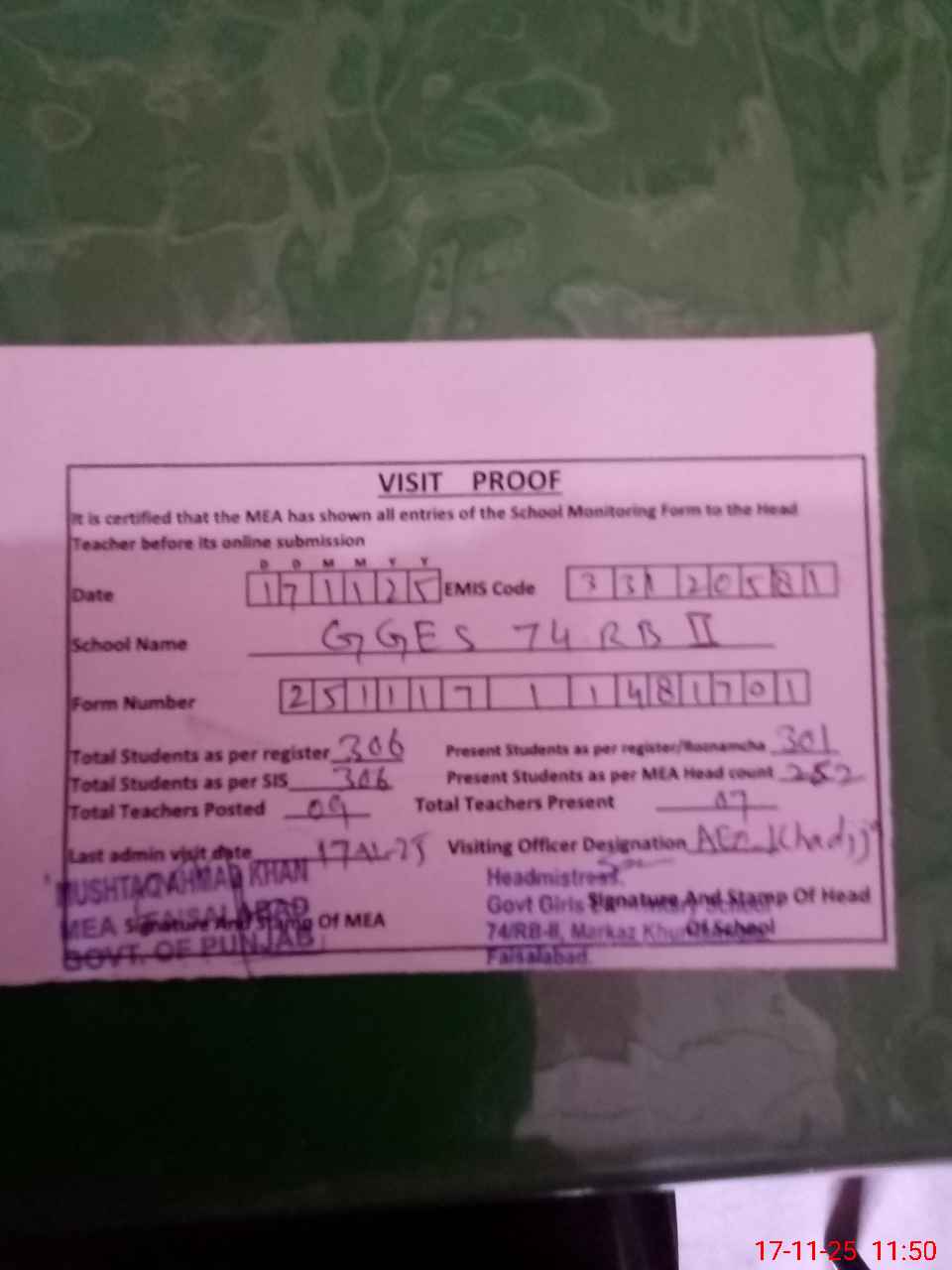 | Attendance Register | Head Teacher | MEA with School | Visit Proof |