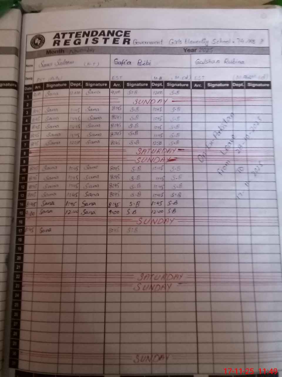 | CNIC | Full Name | Designation | R/C | Absence During Last Calender Month |