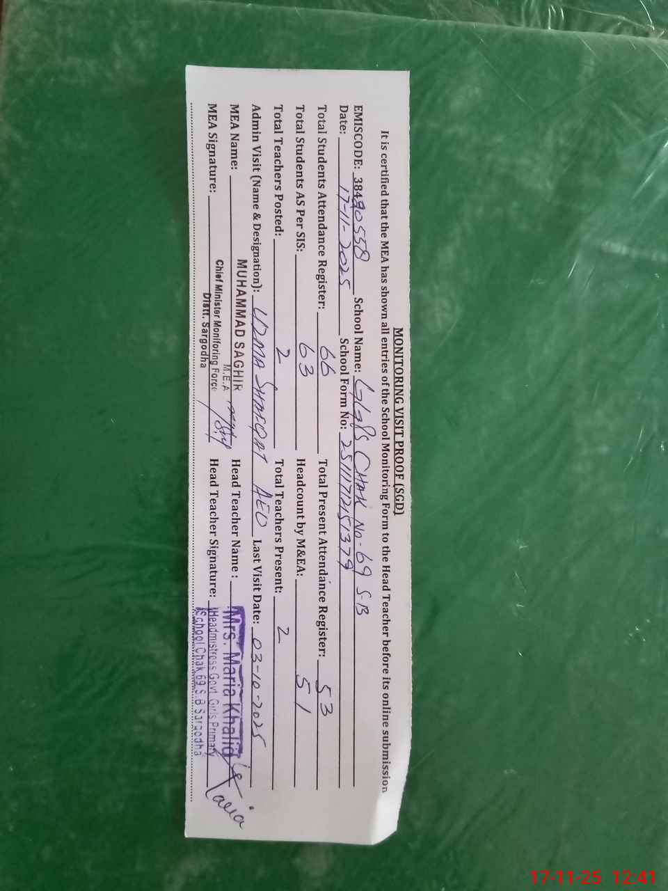 | Attendance Register | Head Teacher | MEA with School | Visit Proof |
