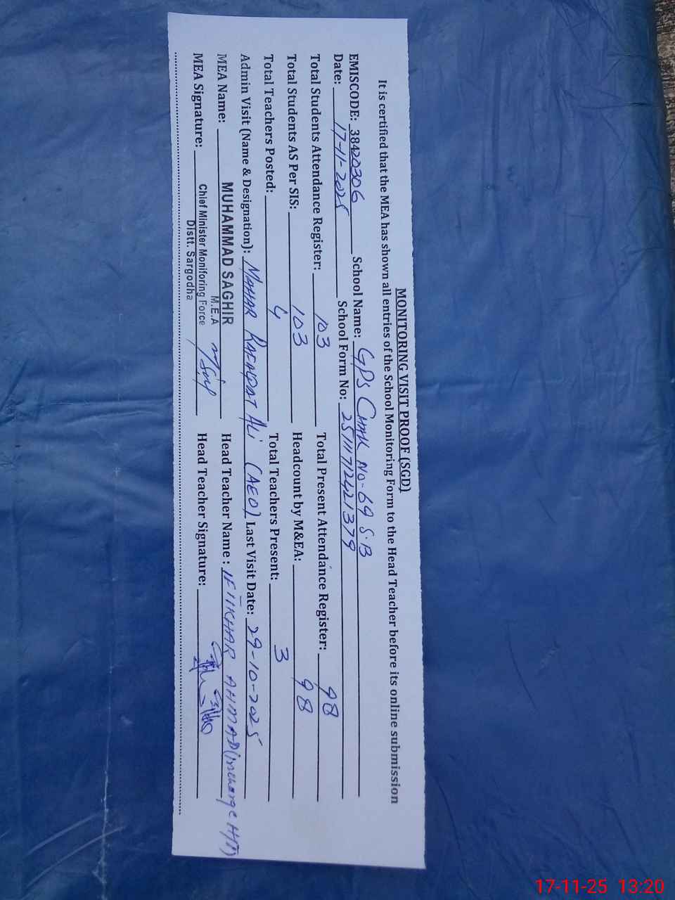 | EMIS Code: 38420306 | Name of School: GPS CHAK NO.69 SB | |||