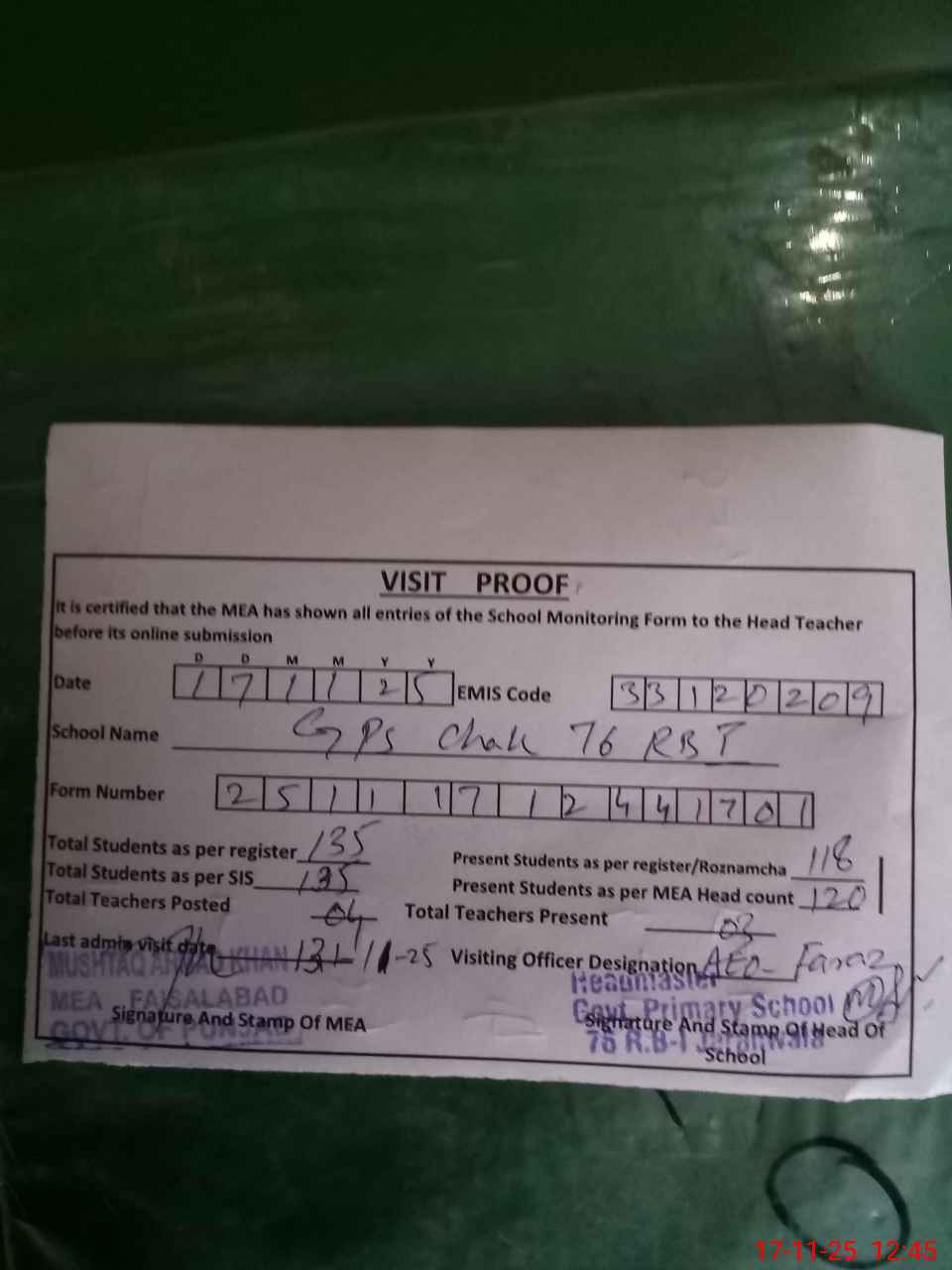 | Attendance Register | Head Teacher | MEA with School | Visit Proof |