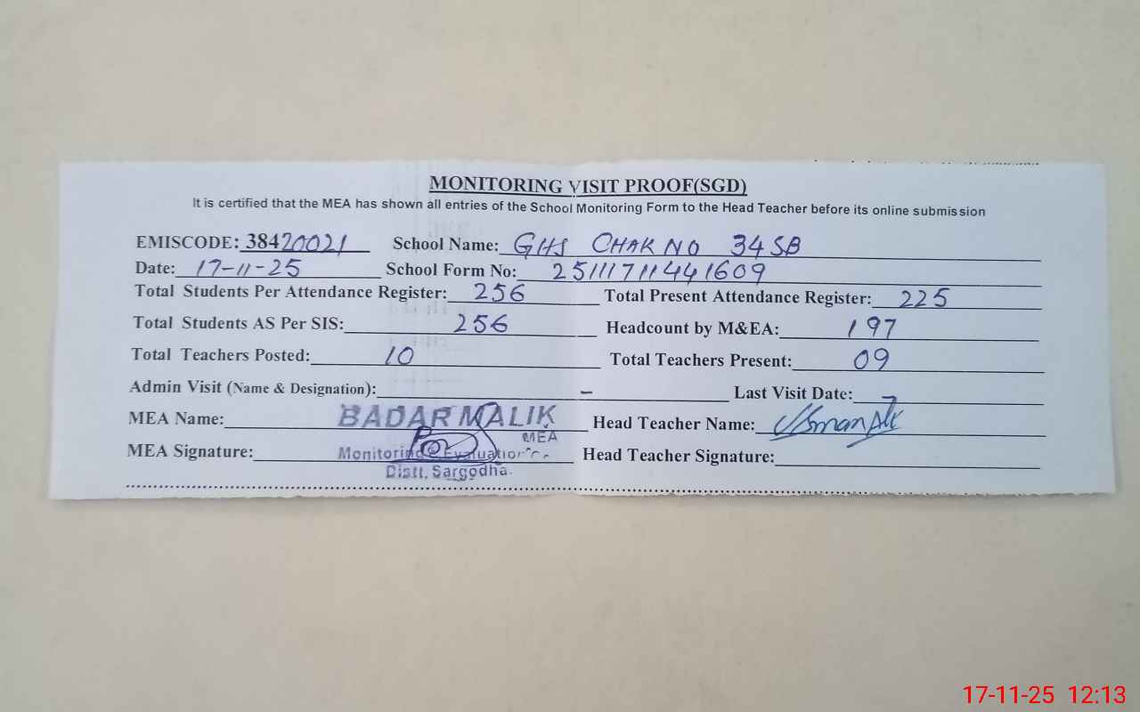 | EMIS Code: 38420021 | Name of School: GHS CHAK NO.34 SB | |||
